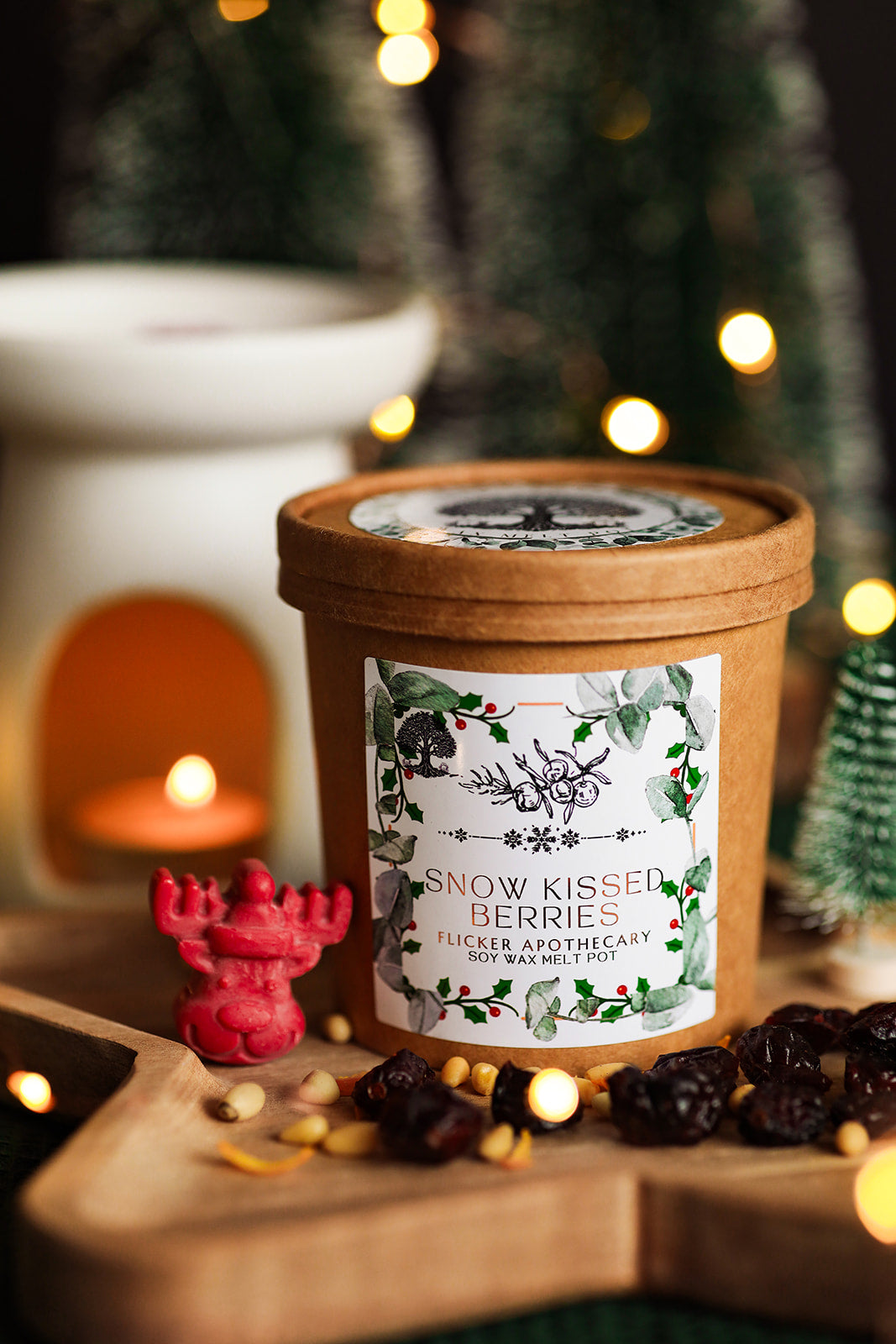 Capture the magic of winter with our Snow Kissed Berries wax melts. This enchanting fragrance opens with juicy notes of piney juniper berry and sweet elderberry, immediately drawing you in with its crisp, fruity charm. At its heart, tart cranberry blends with zesty orange peel and crisp apple, creating a refreshing burst of festive brightness. Finally, the scent rests on a light, earthy base of nutty pine and soft musk, grounding the sweetness with a touch of cosy depth. A refreshing yet comforting winter treat for the senses